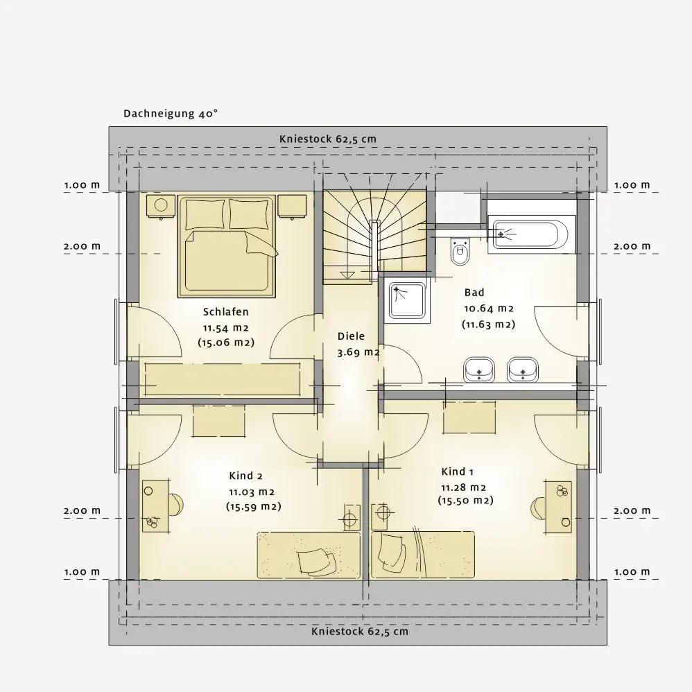 Im Dachgeschoss entsteht eine ruhige Familienetage mit zwei Kinderzimmern, einem Elternschlafzimmer sowie einem großzügigen Bad. Durch die Dachform entsteht hier ein besonders gemütliches Wohngefühl, das Geborgenheit ausstrahlt und gleichzeitig genügend Platz für Rückzug und Privatsphäre bietet.