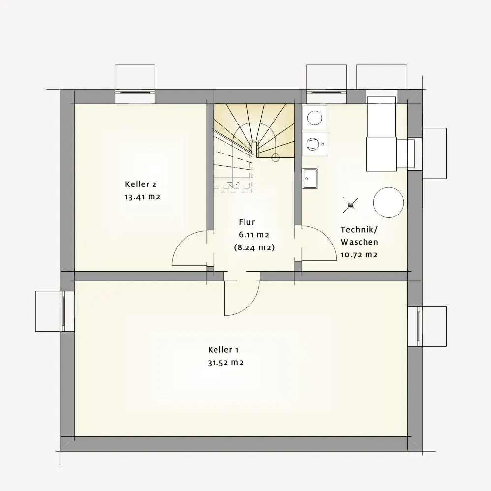 Das Untergeschoss ergänzt das Raumangebot mit großzügigen Nutzflächen für Technik, Waschen, Vorräte oder Hobby und schafft damit wertvollen zusätzlichen Raum, ohne die Wohnbereiche oben zu belasten.