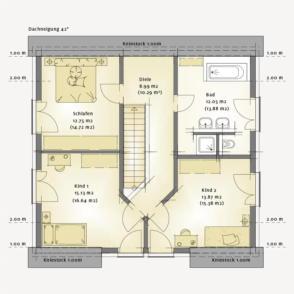 Im Dachgeschoss entsteht eine ruhige Familienetage mit zwei Kinderzimmern, einem Elternschlafzimmer und einem großzügigen Bad. Die Dachform verleiht den Räumen eine gemütliche Wohnatmosphäre mit Geborgenheit, ohne dabei an Helligkeit oder Raumgefühl zu verlieren. Die zentrale Diele verbindet die Zimmer klar und sorgt für eine harmonische Struktur der Etage.