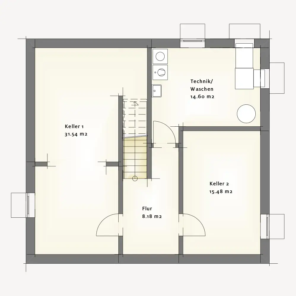 Das Untergeschoss rundet das Raumangebot mit großzügigen Nutzflächen ab und bietet viel Platz für Technik, Waschen, Vorräte oder Hobby – ideal, um die Wohnetagen darüber frei und ruhig zu halten.