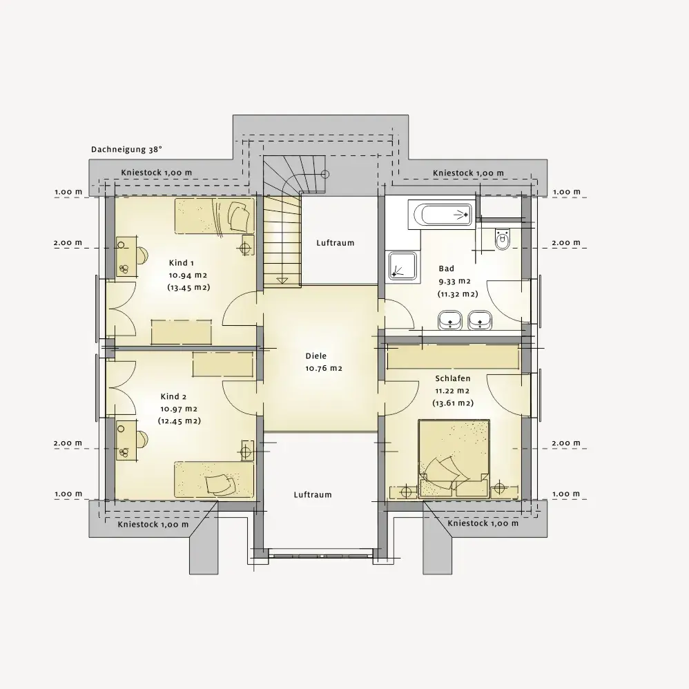 Im Dachgeschoss setzt sich das familienfreundliche Konzept fort und entfaltet durch die Lufträume eine besondere Großzügigkeit, die man in dieser Form selten findet. Zwei helle Kinderzimmer schaffen Platz für Spielen, Lernen und eigene kleine Welten, während der Elternbereich bewusst ruhig angeordnet ist und Geborgenheit vermittelt. Das Bad ergänzt die Etage komfortabel und macht sie alltagstauglich für die ganze Familie. Die offene Raumwirkung sorgt dabei für ein Wohngefühl, das luftig wirkt – und trotzdem gemütlich bleibt.