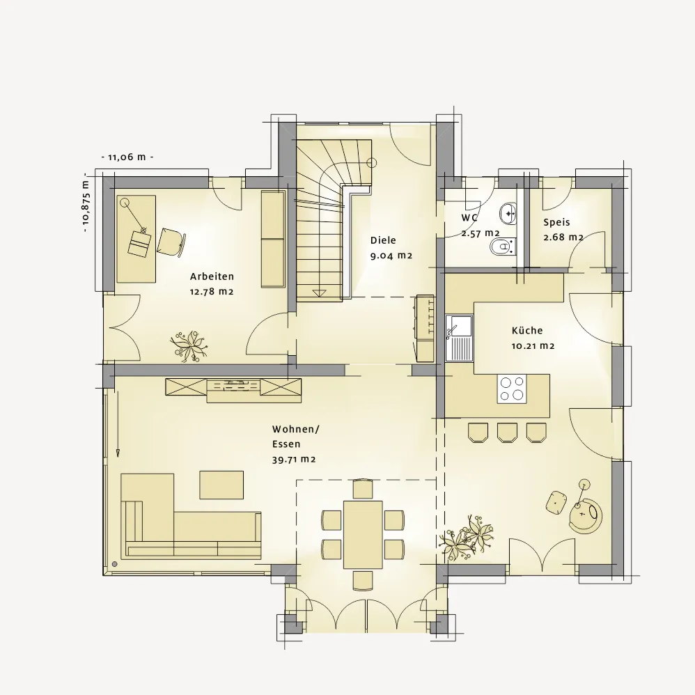 Im Erdgeschoss öffnet sich der Wohn- und Essbereich als zentraler Mittelpunkt des Hauses und bildet den lebendigen Treffpunkt für den Alltag. Die Küche ist separat, aber gleichzeitig nah am Geschehen geplant und wird durch eine praktische Speisekammer ergänzt – ideal für kurze Wege und ein ordentliches Gesamtbild. Ein Gäste-WC rundet die Ebene funktional ab, während ein separates Arbeitszimmer zusätzlichen Raum für Homeoffice, Gäste oder persönliche Rückzugsmomente bietet. Die klare Raumführung sorgt dafür, dass alles miteinander verbunden ist, ohne an Struktur zu verlieren.