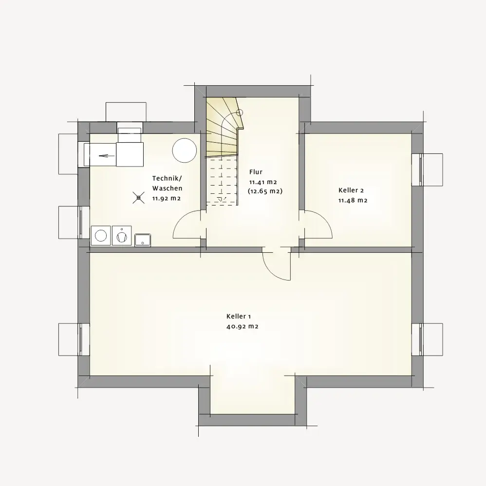 Das Untergeschoss erweitert das Haus um wertvolle Nutzflächen, die sich flexibel für Technik, Waschen, Vorräte oder Hobby einsetzen lassen und den Wohnräumen darüber mehr Ruhe und Ordnung geben.