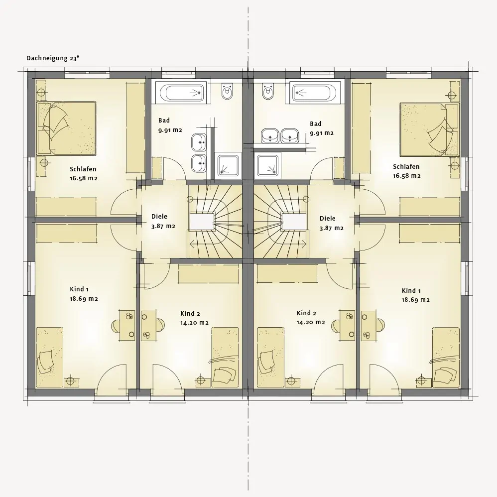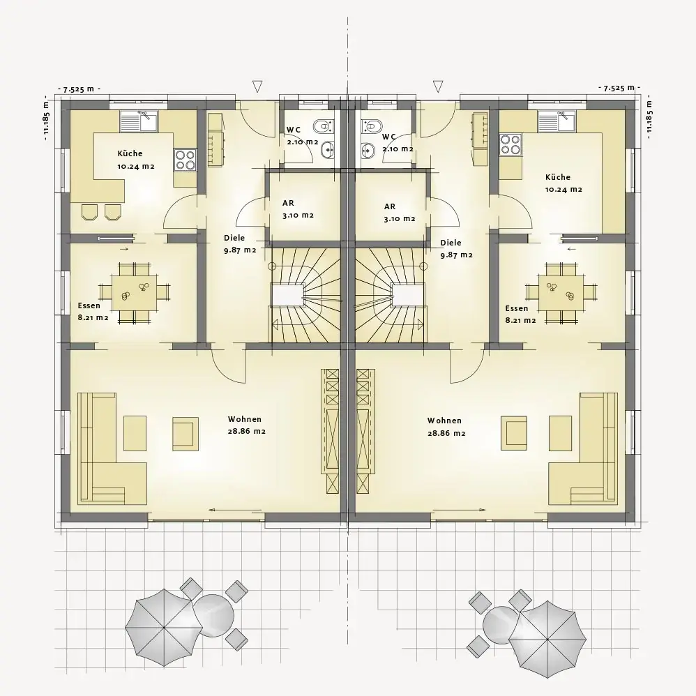 Grundriss eines Doppelhauses mit zwei Wohneinheiten.