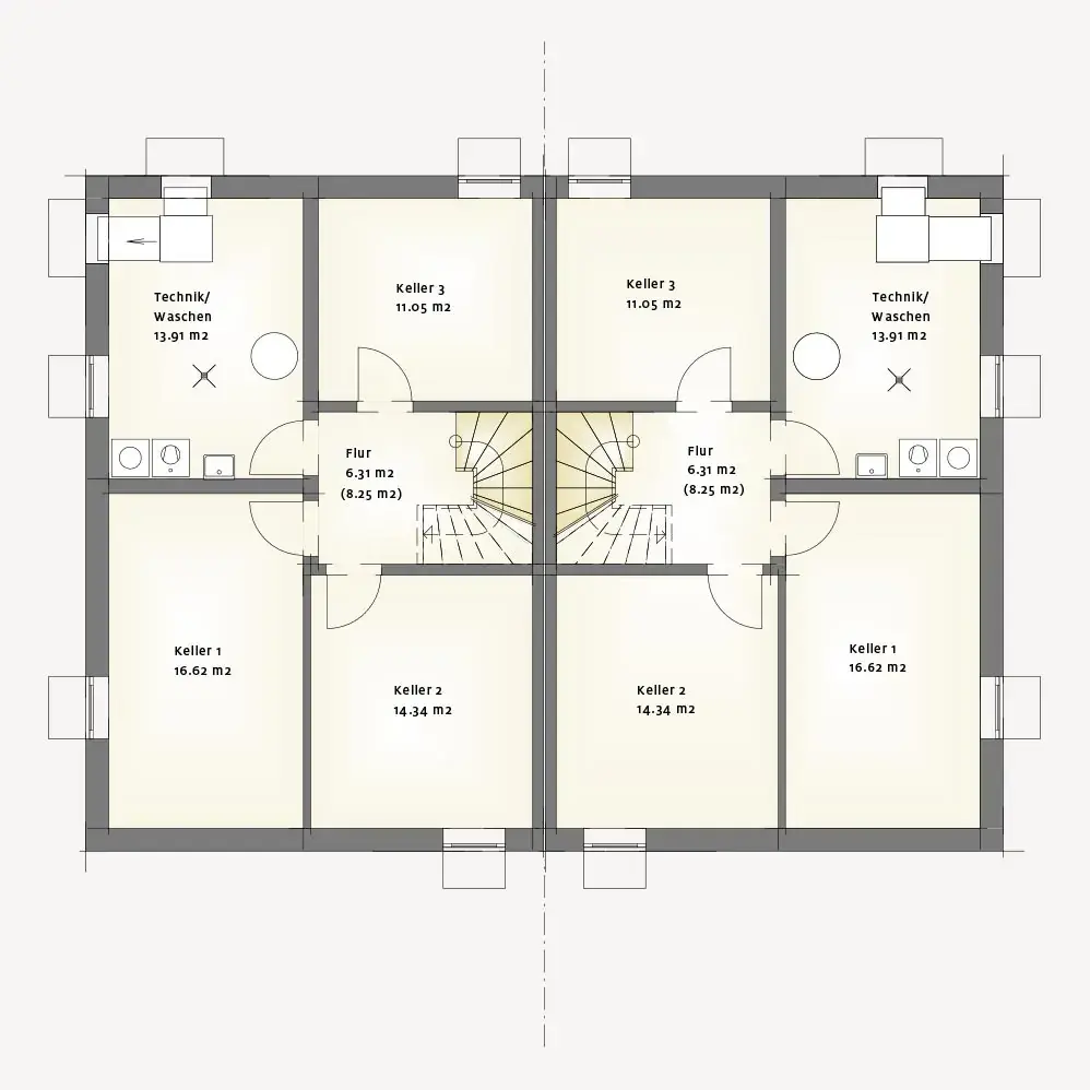 Das Untergeschoss ergänzt das Wohnkonzept um großzügige Nutz- und Technikflächen. Mehrere Kellerräume bieten ausreichend Platz für Vorräte, Hobby, Waschen oder zusätzliche Abstellmöglichkeiten und erhöhen die Alltagstauglichkeit deutlich. Insgesamt vereint das Doppelhaus Genua funktionale Grundrisse, helle Räume und eine ausgewogene Balance aus Offenheit und Rückzug zu einem Zuhause, das ideal auf die Bedürfnisse moderner Familien zugeschnitten ist.