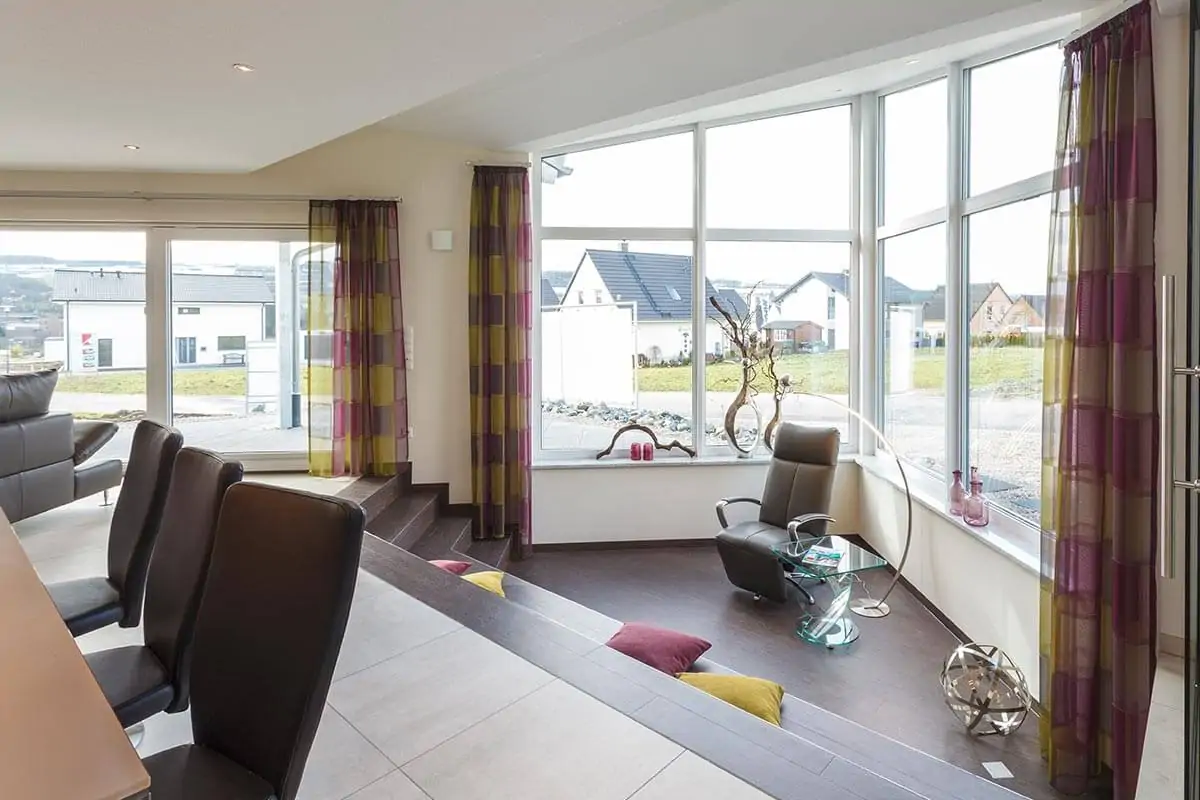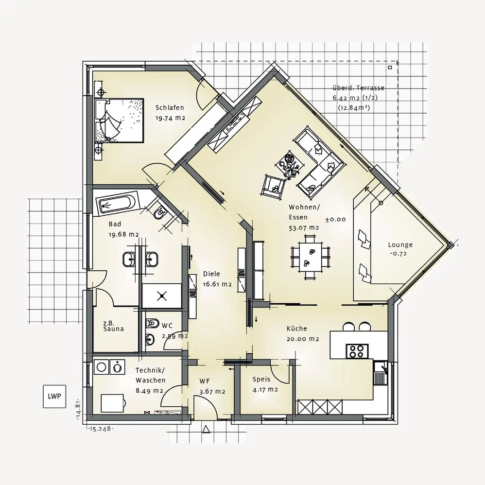 Living steht für ein außergewöhnliches Raumkonzept, das Offenheit, Individualität und architektonische Spannung vereint. Herzstück des Hauses ist der großzügige Wohn-, Ess- und Kochbereich, der sich offen entfaltet und durch seine besondere Geometrie ein einzigartiges Raumgefühl erzeugt. Unterschiedliche Raumtiefen und Blickachsen gliedern den Bereich subtil, ohne die Großzügigkeit zu verlieren, und schaffen eine lebendige, zugleich harmonische Wohnatmosphäre.