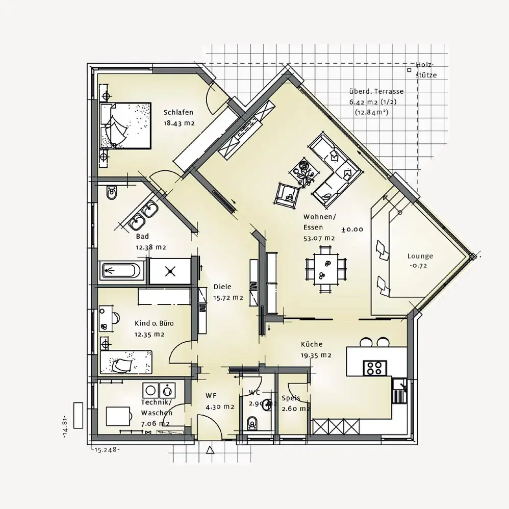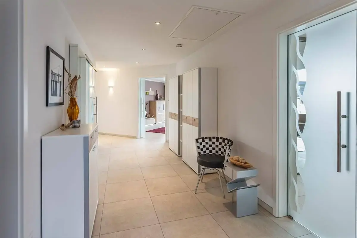 Die Küche ist funktional angebunden und bildet gemeinsam mit dem Essbereich einen kommunikativen Mittelpunkt für den Alltag. Ergänzende Nebenräume wie Speis, Hauswirtschafts- und Technikbereich sind intelligent integriert und halten den Wohnraum klar und aufgeräumt. Die angrenzende Lounge erweitert das Wohnerlebnis und bietet einen besonderen Rückzugsort mit Blickbezug nach außen.