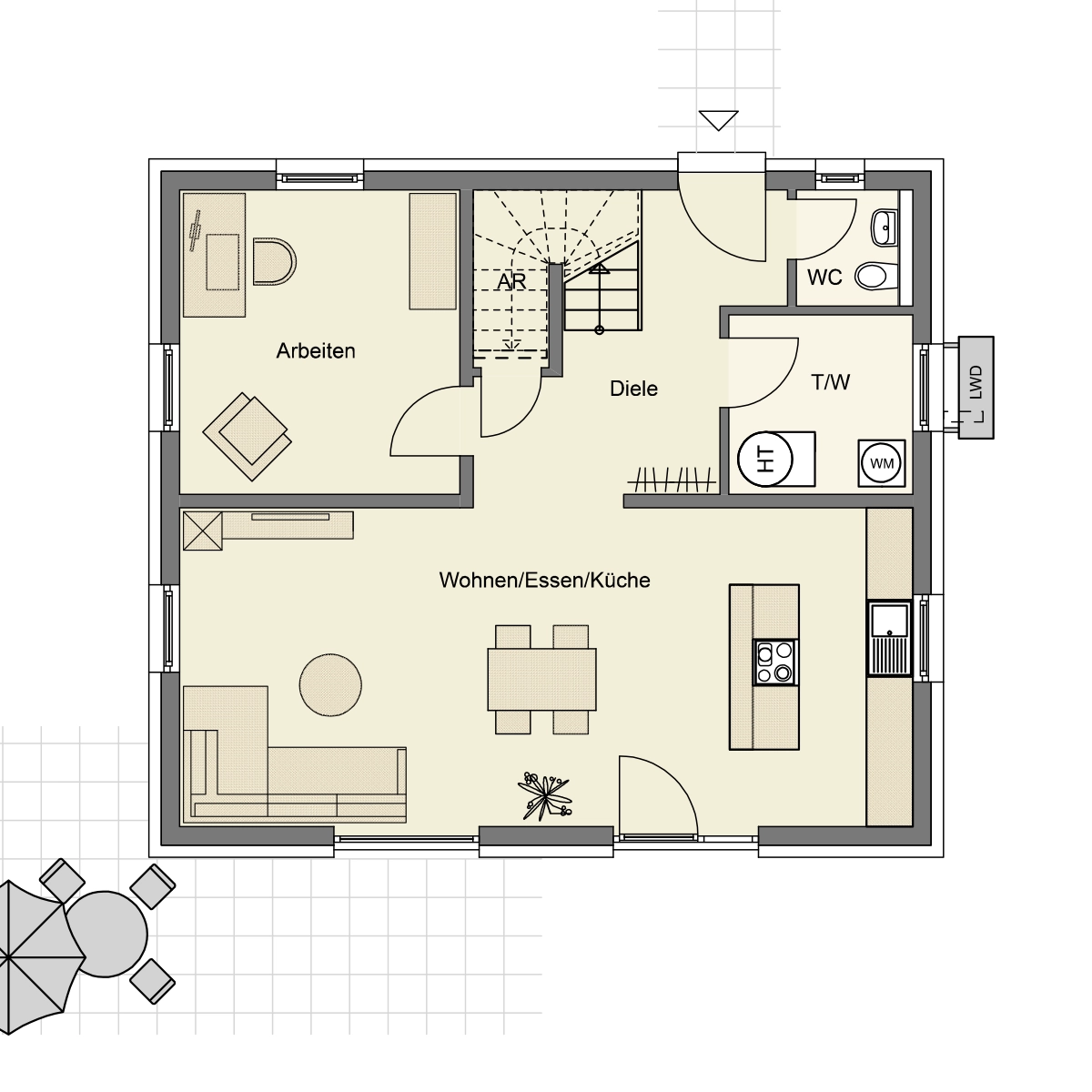 Dieses Musterhaus zeigt das SIMPLY M mit Hauseingang auf der Traufseite und ausgewählten Upgrades für noch mehr Wohnkomfort. Der offene Wohn-, Ess- und Küchenbereich bildet das Herzstück des Hauses und lädt zu gemeinsamen Momenten im Alltag ein.