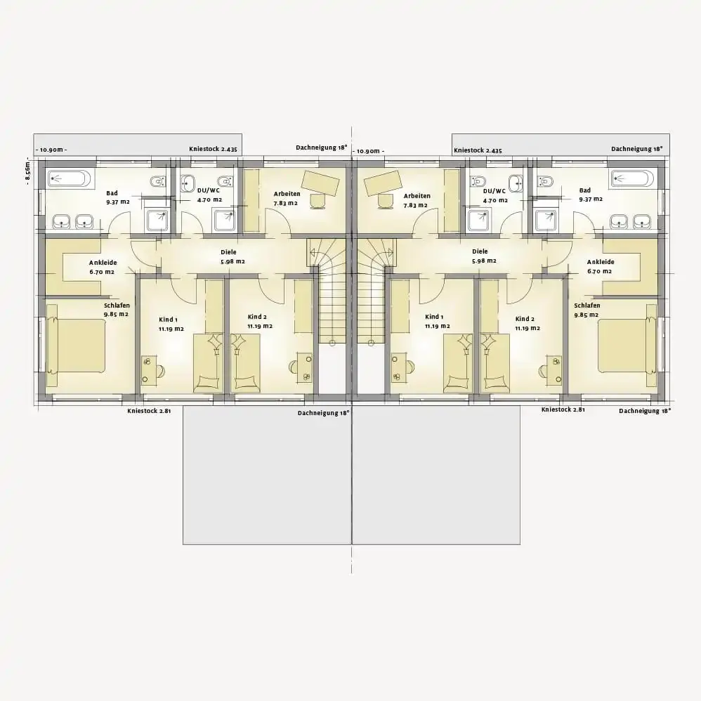 Das Dachgeschoss ist klar als privater Rückzugsbereich konzipiert. Schlaf- und Kinderzimmer sind gleichwertig dimensioniert und bieten vielseitige Nutzungsmöglichkeiten. Die zentrale Diele sorgt für eine ruhige Erschließung aller Räume, während die Bäder komfortabel platziert sind und den Familienalltag effizient unterstützen. Durch die ausgewogene Dachform entsteht ein behagliches Raumgefühl mit guter Möblierbarkeit.