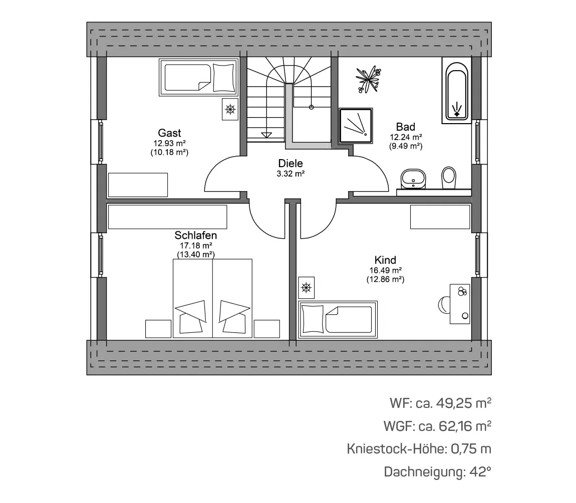 Im Dachgeschoss setzt sich die familienfreundliche Struktur fort und nutzt die gemütliche Raumwirkung unter dem Dach besonders stimmig aus. Neben dem Schlafzimmer entsteht ein weiteres Zimmer, das flexibel als Kinderzimmer, Gästezimmer oder Rückzugsraum genutzt werden kann. Das Bad rundet die Etage komfortabel ab und macht den Grundriss alltagstauglich und angenehm unkompliziert.