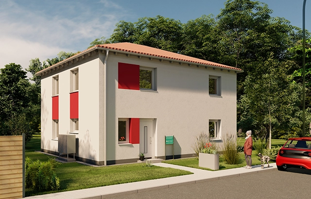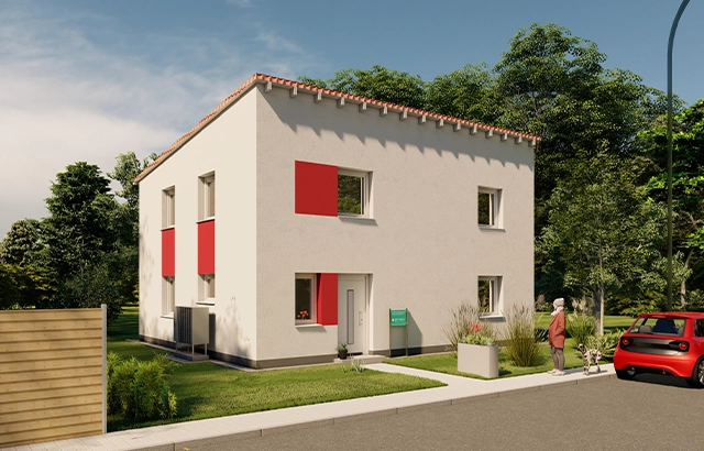 Zweistöckiges Haus mit rotem Auto und Personen auf einer Straße.