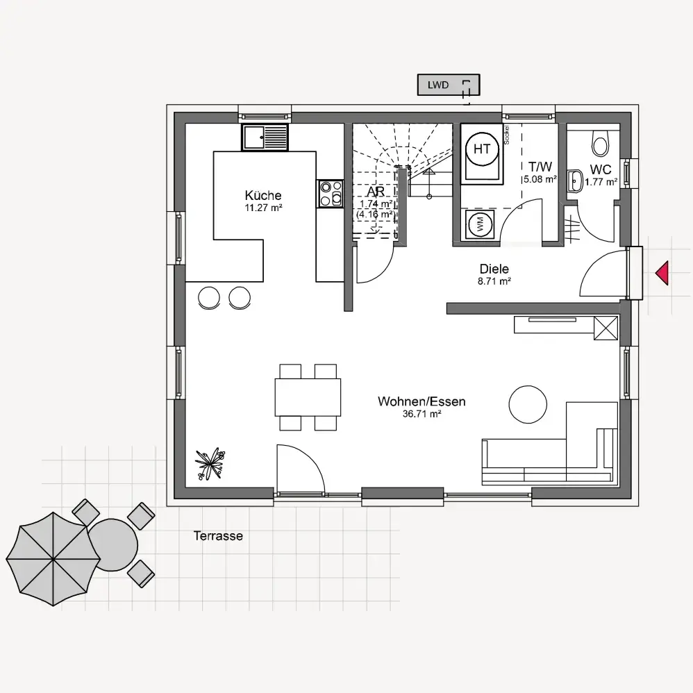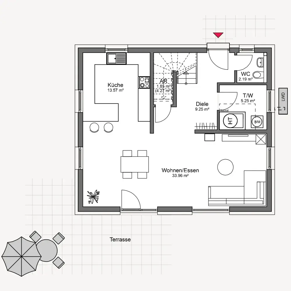 Im Erdgeschoss bildet der offene Wohn- und Essbereich das Herzstück des Hauses. Die Küche ist funktional integriert und fügt sich harmonisch in das Wohnkonzept ein – perfekt für gemeinsames Kochen, Essen und entspannte Abende im Mittelpunkt des Hauses. Durch den direkten Zugang zur Terrasse entsteht ein fließender Übergang nach draußen, der das Wohnen zusätzlich erweitert. Ein Gäste-WC sowie ein kompakter Hauswirtschaftsbereich unterstützen die klare Struktur und sorgen dafür, dass alles seinen Platz findet, ohne die Wohnräume zu überladen.