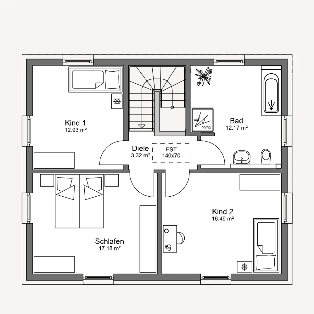 Im Obergeschoss setzt sich die ruhige, familienfreundliche Aufteilung fort. Zwei helle Kinderzimmer bieten Platz für Entwicklung, Lernen und Rückzug, während das Elternschlafzimmer bewusst als ruhige Wohlfühlzone gestaltet ist. Das Familienbad rundet die Etage komfortabel ab und sorgt für einen entspannten Start in den Tag – auch wenn es im Alltag einmal trubeliger wird.