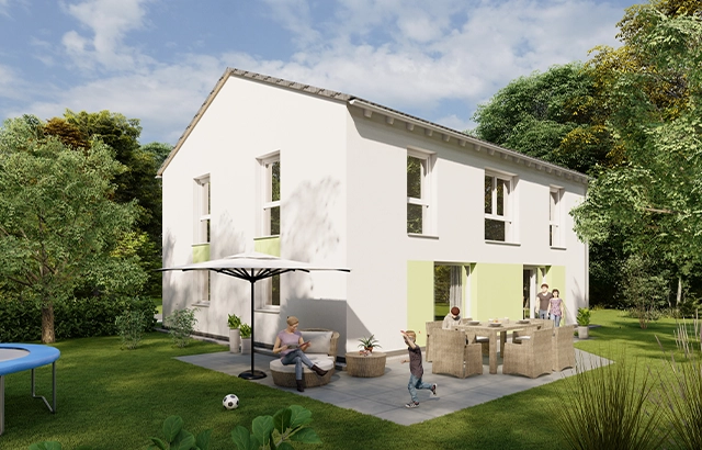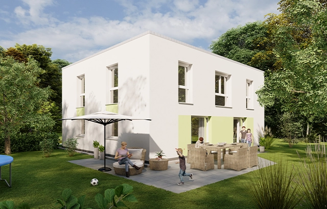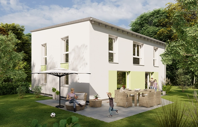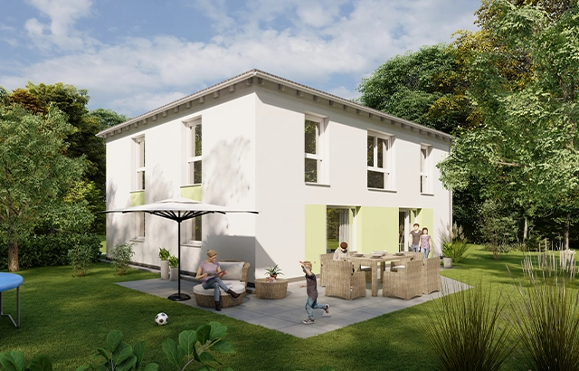 Das SIMPLY E+O XL steht für modernes Familienwohnen mit klarer Architektur, großzügigem Raumgefühl und einem offenen Grundriss, der Licht, Weite und Alltagstauglichkeit perfekt verbindet. Große Fensterflächen öffnen den Wohnbereich zur Terrasse und schaffen eine helle, freundliche Atmosphäre, in der Innen- und Außenraum ganz selbstverständlich ineinander übergehen. Besonders praktisch: Das Haus bietet zwei mögliche Grundrissvarianten im Erdgeschoss – je nachdem, ob der Eingang auf der Trauf- oder Giebelseite liegen soll. Dadurch lässt sich das Konzept flexibel an unterschiedliche Grundstücke und Ausrichtungen anpassen, ohne dass die Großzügigkeit des Wohnens verloren geht.