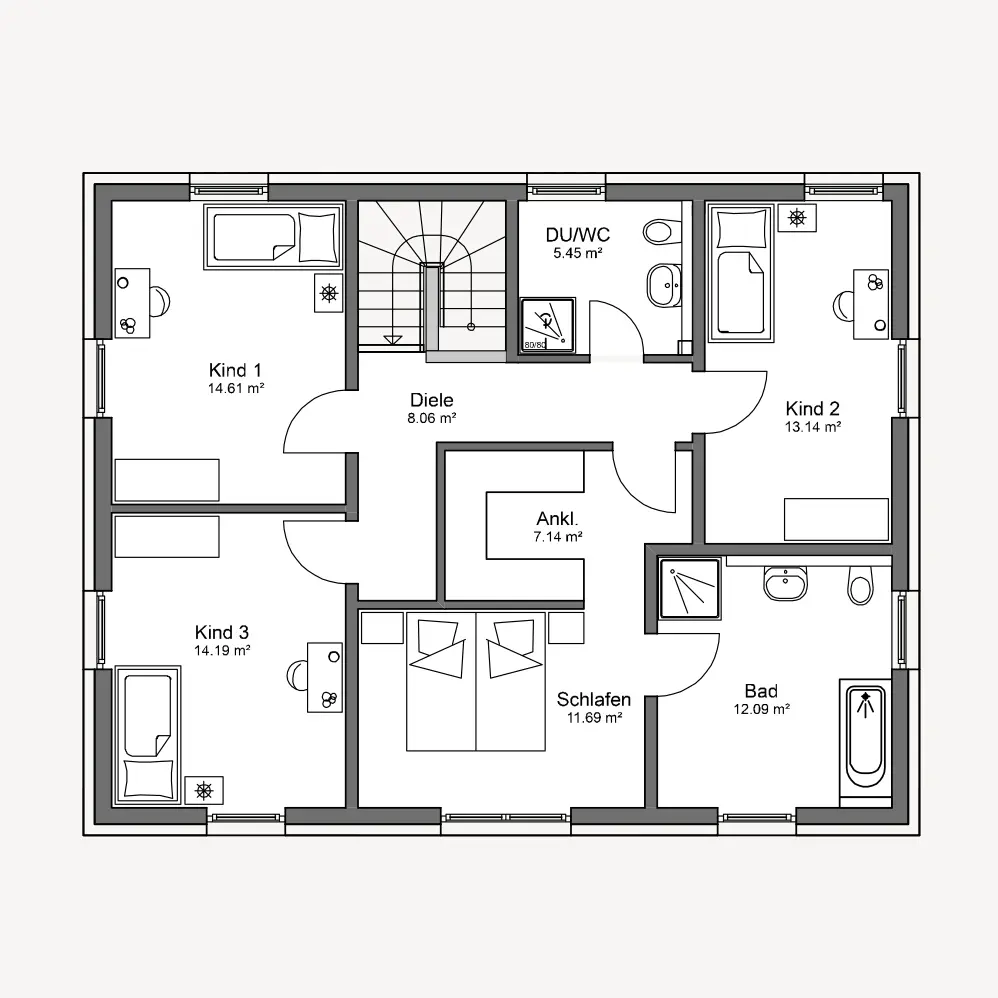 Im Obergeschoss setzt sich die klare Aufteilung fort und schafft Raum für Rückzug und Familienleben gleichermaßen. Drei helle Kinderzimmer bieten genügend Platz für Entfaltung, Spielen und Lernen, während der Elternbereich bewusst ruhiger angeordnet ist und durch eine Ankleide ergänzt wird. Das große Bad rundet die Etage komfortabel ab und macht das Zuhause auch im Alltag angenehm entspannt und familienfreundlich.