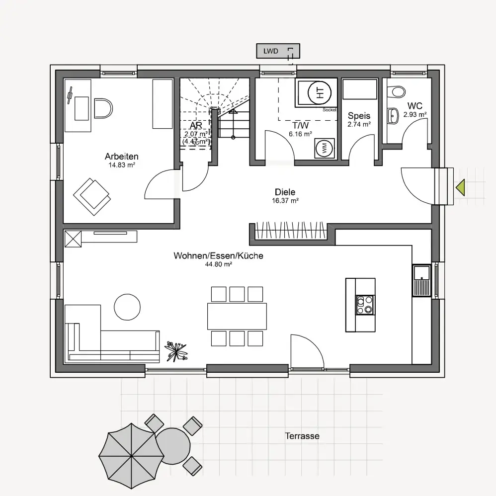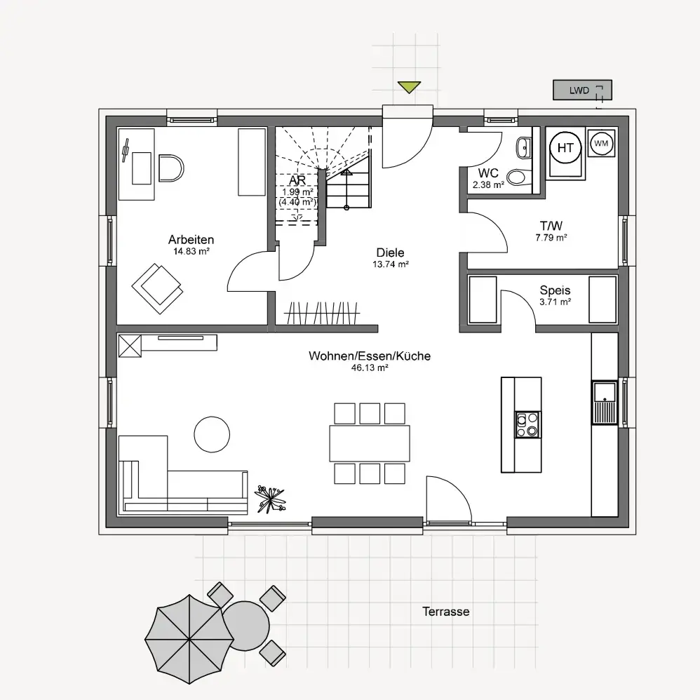 Im Erdgeschoss bildet der offene Wohn-, Ess- und Kochbereich das Herzstück des Hauses. Die Küche ist zentral integriert und unterstützt das kommunikative Wohngefühl – ideal für Familienleben, Gäste und gemeinsame Momente. Ergänzt wird die Ebene durch ein separates Arbeitszimmer, das sich flexibel als Homeoffice, Hobbyraum oder Gästezimmer nutzen lässt. Besonders angenehm im Alltag sind die funktionalen Nebenräume: Hauswirtschafts- bzw. Technikbereich, Gäste-WC und eine praktische Speisekammer sorgen für Ordnung, Struktur und kurze Wege.