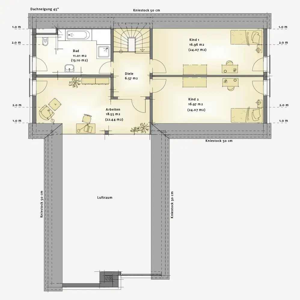Im Dachgeschoss setzt Varedo das großzügige Raumgefühl konsequent fort. Zwei helle Kinderzimmer mit jeweils rund 17 m² bieten viel Platz für individuelle Gestaltung, Lernen und Entfaltung. Ein separater Arbeitsbereich mit ca. 18 m² schafft Raum für konzentriertes Arbeiten oder kreative Nutzung. Das Bad ist zentral angeordnet und komfortabel dimensioniert, während die offene Galerie mit Luftraum dem Haus zusätzliche architektonische Spannung verleiht und die Geschosse visuell miteinander verbindet.