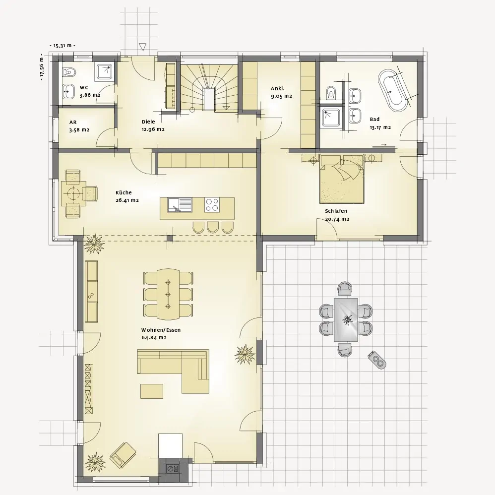 Varedo lebt von Großzügigkeit, Offenheit und einer klaren architektonischen Haltung. Bereits im Erdgeschoss entfaltet sich der zentrale Wohn-, Ess- und Kochbereich mit beeindruckenden rund 65 m² als kommunikatives Herz des Hauses. Die offene Raumstruktur schafft Weite und Transparenz, während großflächige Verglasungen den Innenraum mit Tageslicht fluten und den Blick selbstverständlich nach außen auf die Terrasse lenken. Wohnen, Essen und Kochen gehen fließend ineinander über und bieten ideale Voraussetzungen für gemeinsames Familienleben ebenso wie für gesellige Abende.